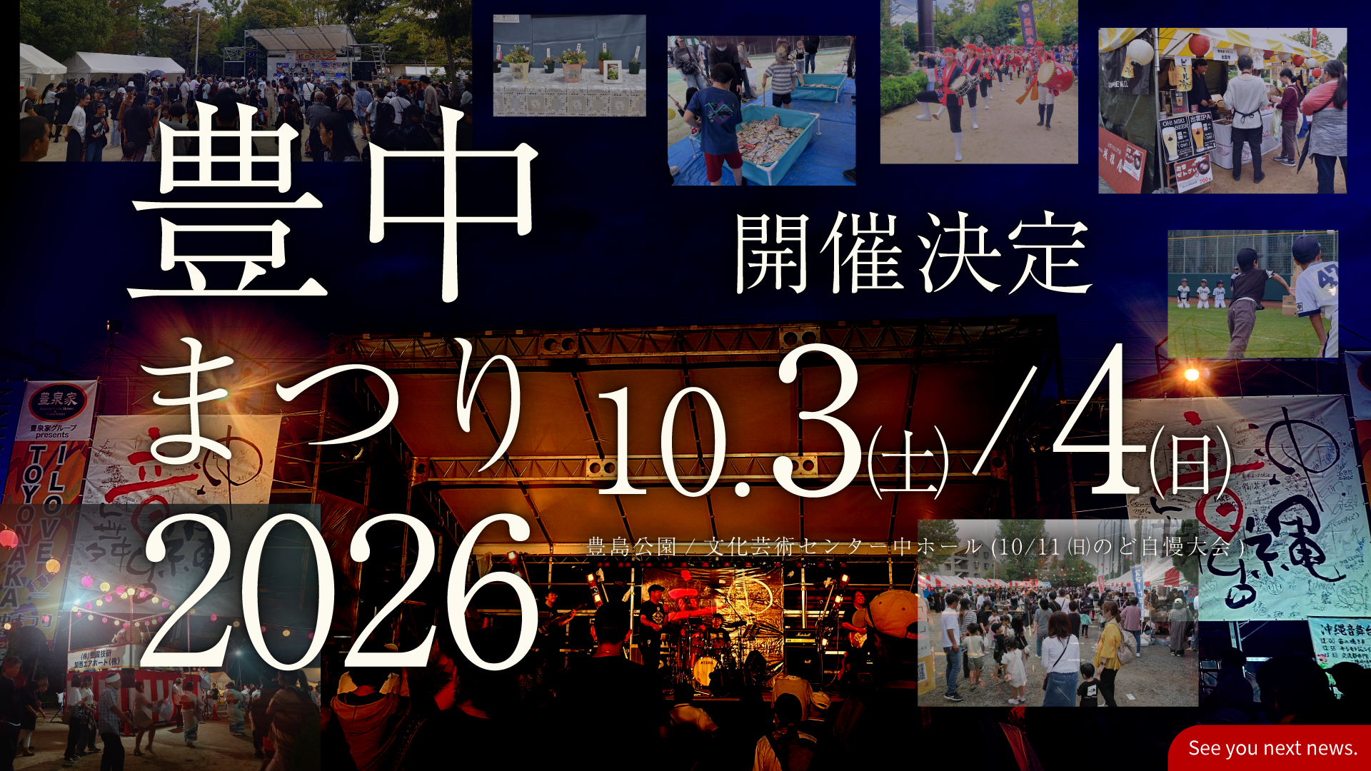 豊中まつり2025は 10月18日(土)19日(日)に開催いたします。 みなさまのご支援、ご協力のもと「豊中まつり」は、今年で58回目を迎えます。豊中まつりは「人と文化が…